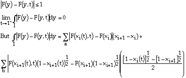 These seven lemmas permit me to characterize the general semi-solution and find its value C, as follows. Consider a semi-solution F. By lemmas 1, 6, and 7, (0,1) is partitioned by B into a countable number of intervals on whose interior F is continuous. By lemma 3,