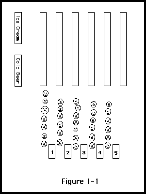 Consider any two adjacent lines in Figure 1-1, say Lines 4 and 5. Some shoppers will approach the checkout area not from one end, as you did, but from the aisle that lies between those two lines. Since those shoppers can easily see both lines, they will go to whichever one appears shorter. By doing so, they will lengthen that line and shorten the other; the process continues until both lines are the same length. The same argument holds for every other pair of adjacent lines, so all lines will be the same length. It is not worth it for you to make a costly search for the shortest line.
