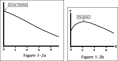 This sort of result is called a corner solution because it corresponds to the mathematical situation where the maximum of a function is not at the top of its graph but instead at a corner where the graph ends, as shown in Figure 1-2a. In such a situation, the normal conclusion (in the supermarket case, that all the lines must be the same length) may no longer hold. The corresponding result in Figure 1-2a is that the graph is not horizontal at its maximum--as it would be if the maximum were at an interior solution, as it is in Figure 1-2b. In economics--especially mathematical economics--the usual role of corner solutions is to provide annoying exceptions to general theorems.