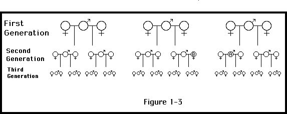 Three generations of a population with a male:female ration of 1:2. Members of the first generation who have a son produce twice as many grandchildren as those who have a daughter, so genes for having sons increase in the population, swinging the sex ratio back toward 1:1.