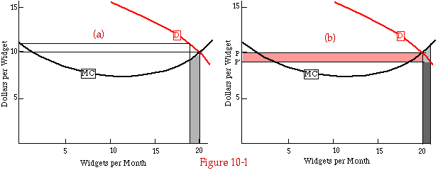 We start with a monopoly that finds it must sell all of its output at the same price; the reasons why it must do so will be discussed later, when we consider the problems faced by firms that try to sell at different prices to different customers. Consider the widget firm whose situation is shown in Figure 10-1a. D is the total demand curve for widgets; since there is only one firm producing widgets, it is also the demand curve faced by that firm. MC is its marginal cost curve. The firm is producing at a quantity where MC = P, just as Chapter 9 says it should. Quantity is 20 widgets per month; price is $10/widget.