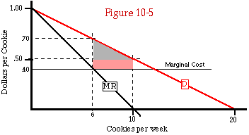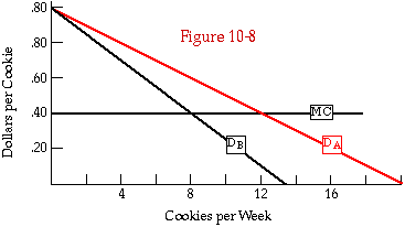 Looking at the figure, we--and the president of the cookie company--make the following observation. Additional cookies cost $0.40 each to make. Up to a quantity of 12 cookies per week, additional cookies are worth more than $0.40 each to the customer (remember that a demand curve for an individual is also his marginal value curve). It seems a pity to lose those additional sales--and the money that could be made on them.