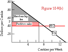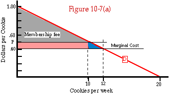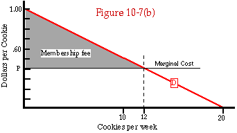 There is an easier way to do the same thing. The next year, the company announces a new and much simpler pricing policy. Cookies will no longer be sold to the general public--only to members of the cookie club. Members can buy cookies at cost--$0.40/cookie--and may buy as many as they wish at that price. The membership fee is $3.60/week. That, by a curious coincidence, is the total consumer surplus received by a consumer who is free to buy as many cookies as he wants at a price of $0.40/cookie. This two-part price (membership plus per-cookie charge) first maximizes the sum of consumer and producer surplus (by inducing the consumer to buy every cookie that is worth at least as much to him as it costs to produce) then transfers the entire consumer surplus to the producer.