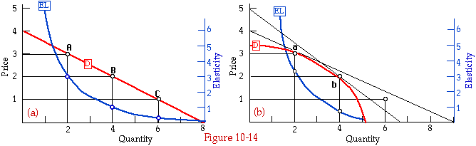 Figure 10-14a shows how price elasticity varies with quantity along a straight line demand curve. The figure has two vertical axes; the one on the left shows price, the one on the right elasticity. The slope of a straight line is the same everywhere (-1/2 for the demand curve shown on the figure) so dQ/dP = 1/(dP/dQ) = 1/(-1/2) = -2. Elasticity equals -(P/Q)dQ/dP; P/Q varies along the line. It is equal to infinity at the left end of D, where P = 10 and Q = 0; it is equal to zero at the right end, where Q = 20 and P = 0. Along the curve, elasticity varies as shown in Figure 10-14a. Points A, B, and C have been marked to allow you to check that the curve correctly shows the elasticity at those points.
