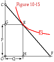 So one can calculate the elasticity of a demand curve by simply drawing the tangent and taking the ratio between EF (the distance from the point of tangency to the intersection with the quantity axis) and CE (the distance from the point of tangency to the intersection with the price axis). This gives us a simpler way of calculating the elasticity of a demand curve than the one shown on Table 10-1.