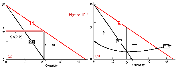 Now that we have a marginal revenue curve, maximizing the monopolist's profit is simple. If marginal revenue is higher than marginal cost, he should increase his output--the additional revenue (even allowing for the effect of the fall in price) is greater than the additional cost. If marginal revenue is lower than marginal cost, he should decrease output. If he has the correct (i.e., profit-maximizing) output, marginal revenue will be equal to marginal cost. This solution is shown on Figure 10-2b.