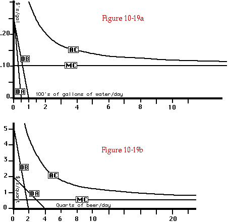 12. Figures 10-19a and 10-19b show demand curves, marginal cost curves, and average cost curves for two monopolies. In the first case, there are 10 customers with demand curve DA and 10 with DB; in the second case, there are 10 type A and 5 type B customers. Note that average cost is shown as a function of total quantity produced, while each of the demand curves relates price to the quantity bought by a single customer.