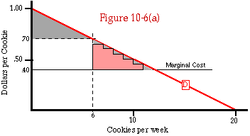 Figure 10-6b is very close to perfect discriminatory pricing--a price schedule that transfers all of the consumer surplus to the producer. Its imperfection--the "crumbs" referred to in the previous paragraph--comes from the problem of describing a discontinuous variable (3 cookies or 4 cookies but never 3.141532 cookies) with concepts, such as marginal value, more suited to continuous variables (water--or wine). It is possible, by setting the price schedule perfectly, to use such a set of prices to end up with all the surplus, crumbs included.