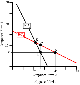 Suppose the firms start instead at point A. Firm 1 is producing its optimal quantity (13) given that Q2 is 40, but 40 is not the optimal quantity for Firm 2, given that Q1 is 13. So Firm 2 shifts its output to put it on its reaction curve at point B. Now its output is optimal, given what Firm 1 is doing. But Firm 1 is no longer on its reaction curve; 13 units is not its optimal output, given what Firm 2 is now doing, so Firm 1 increases Q1, moving to point C.