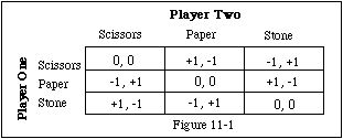 I have started with this game for two reasons. The first is that, because each player makes one move and the moves are revealed simultaneously, it is easily represented by a matrix such as Figure 11-1, with one player choosing a row, the other choosing a column, and the outcome determined by their intersection. We will see later that this turns out to be a way in which any two-person game can be represented, even a complicated one such as chess.
