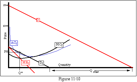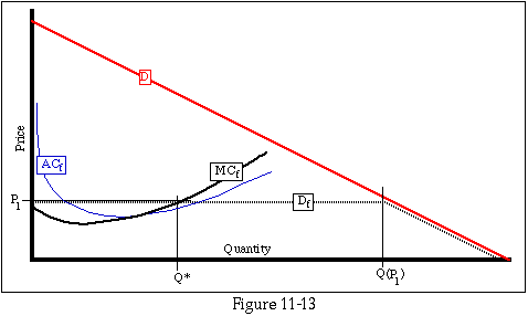 The firm in this situation has three alternatives, as shown by Df. It can charge more than Pl and sell nothing. It can charge Pl and sell an indeterminate amount--perhaps Q(Pl)/N, if there are N firms each charging Pl. It can charge less than Pl, say one penny less, and sell as much as it wants up to Q(Pl). It is easy to see that the last choice maximizes its profit. It is facing the horizontal portion of the demand curve Df, so the quantity it sells (up to Q(Pl), which on this figure is more than it wants to sell) does not affect the price. It maximizes its profit by producing Q* and selling it for just under Pl.