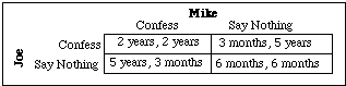 The DA puts the criminals in separate cells. He goes first to Joe. He tells him that if he confesses and Mike does not, the DA will drop the burglary charge and let Joe off with a slap on the wrist--three months for trespass. If Mike also confesses, the DA cannot drop the charge but he will ask the judge for leniency; Mike and Joe will get two years each.