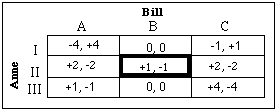 A strategy of this sort is sometimes called a minimax strategy; the solution is referred to as a saddle point. It is called a minimax because, seen from Bill's standpoint, he is minimizing the maximum amount he can lose; he acts as if he were assuming that, whatever he does, Anne will pick the right strategy against him. If he chose A, Anne could choose II, in which case he would lose 2; if he chose C, Anne could choose III, in which case he would lose 4. Precisely the same thing is true from Anne's standpoint; strategy II is her minimax as well. The Von Neumann solution has the interesting characteristic that each player acts as if the other one knew what he was going to do. One player does not in fact know what strategy the other is choosing, but he would do no better if he did.