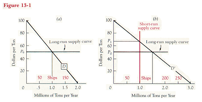 Figure 13-1b shows the effect of a sudden increase in the demand for shipping--from D to D'. In the short run, the supply of shipping is perfectly inelastic, since it takes a year to build a ship. The price shoots up to P1, where the new demand curve intersects the short-run supply curve.