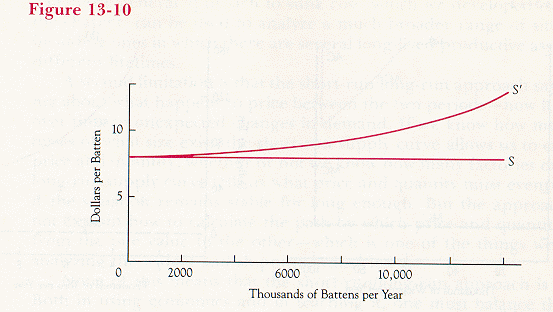 Two possible long-run supply curves for the batten industry. S, which is horizontal at a price equal to minimum average cost, is drawn on the assumption that inputs are available in perfectly elastic supply. S' is drawn on the assumption that as quantity increases, input prices are bid up.