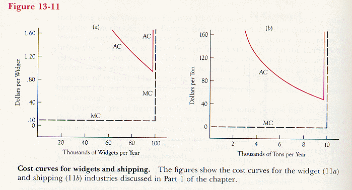 The most important lesson is how to calculate the behavior of the firm over the short run. In all of the earlier examples of this chapter, the firms had simple all-or-none patterns of production. A widget factory either produced at capacity or shut down; a ship continued to carry a full load of freight as long as it got anything at all for doing so. We were, in effect, assuming the cost curves shown in Figures 13-11a and 13-11b--marginal cost constant up to some maximum level of production and infinite beyond that. We were also assuming that there was only one kind of factory and one kind of ship.