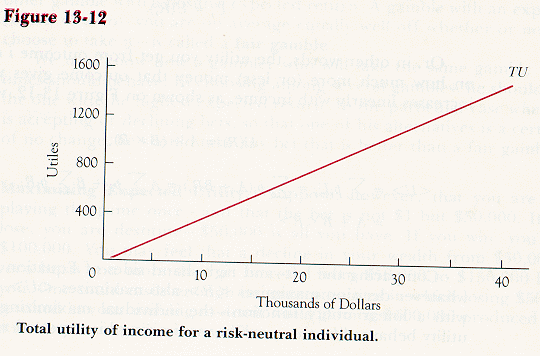There are three other important situations in which maximizing expected utility turns out to be equivalent to maximizing expected return. One is when the individual is risk-neutral, as shown on Figure 13-12. A second is when the size of the prospective gains and losses is small compared to one's income. If we consider only small changes in income, we can treat the marginal utility of income as constant; if the marginal utility of income is constant, then changes in utility are simply proportional to changes in income, so whatever choice maximizes expected return also maximizes expected utility.