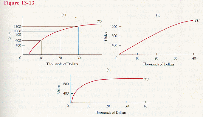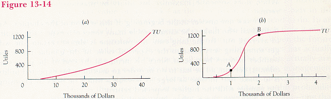 Total utility of income for a risk preferrer and for someone who is risk preferring for some incomes and risk averse for others. Figure 13-14b shows total utility of income for someone who requires about $1,500 to stay alive. Below that point, the marginal utility of income (the slope of total utility) increases with increasing income; above that point, it decreases.