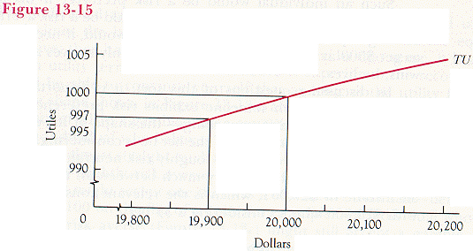 One can see the same thing geometrically. Figure 13-15 is a magnified version of part of Figure 13-13a. If we consider only a very small range of income--between $19,900 and $20,000, for instance--the utility function is almost straight. For a straight-line utility function, as I showed earlier, maximizing expected utility is equivalent to maximizing expected return. So if we are considering only small changes in income, we should act as if we were risk neutral.