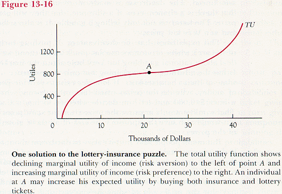 There are at least two possible ways in which it can. One is illustrated on Figure 13-16. The individual with the utility function shown there is risk averse for one range of incomes and risk preferring for another, higher, range. If he starts at point A, in between the two regions, he may be interested in buying both insurance and lottery tickets. Insurance protects him against risks that move his income below A--where he is risk averse. Lottery tickets offer him the possibility (if he wins) of an income above A--where he is risk preferring.