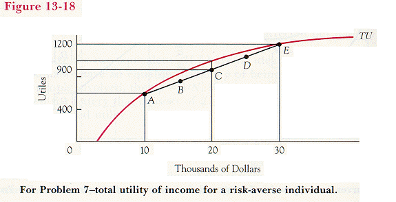 7. Figure 13-18 is identical to Figure 13-13a, with the addition of a line connecting two points--A and E--on the utility function. I claim that point C, halfway between points A and E, represents the utility (vertical axis) and expected return (horizontal axis) of a fifty-fifty gamble between A ($10,000) and E ($30,000); the fact that C is below the graph of the utility function indicates that you prefer a certainty with the same expected return ($20,000) to such a gamble. Similarly, I claim that point B represents a gamble with a 75 percent chance of giving you A and a 25 percent chance of giving you E, and that point D represents a gamble with a 25 percent chance of A and a 75 percent chance of E.