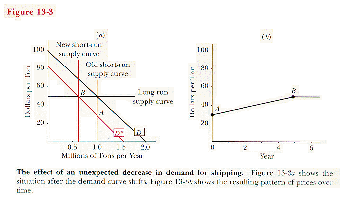 Suppose that instead of the increase in demand shown in Figure 13-1b, there is instead a decrease in demand, from D to D", as shown in Figure 13-3a. Price drops. Since there are no operating costs, existing ships continue to carry cargo as long as they get any price above zero. The price is at the point where the old (short-run) vertical supply curve intersects the new demand curve (A).