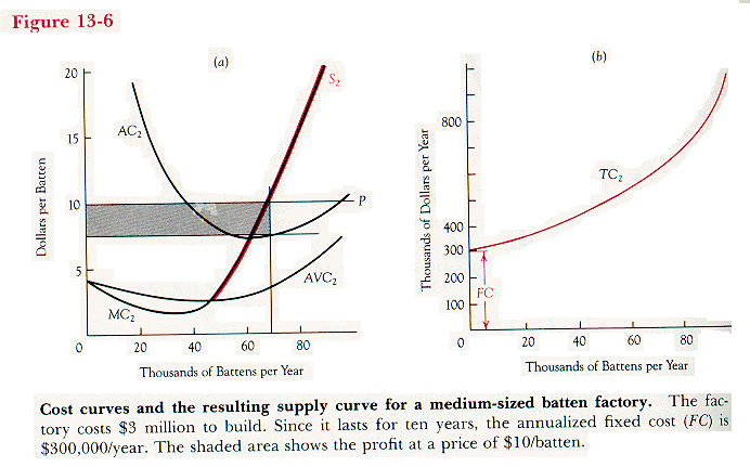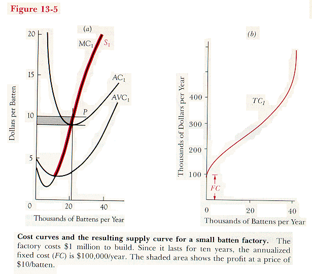 Suppose the batten firm has built the factory of Figure 13-5. The market price of a batten is P; the firm must decide how many to produce each year. Just as in Chapter 9, the firm maximizes its profit by producing the quantity for which MC = P, provided that at that quantity it is not losing money.