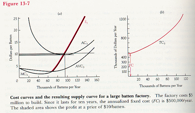 Figures 13-5 through 13-7 show the calculations for a price of $10/batten. As we already know, if a price-taking firm produces at all, it maximizes its profit by producing a quantity for which MC = P. So for each size of factory, a firm that chose to build that factory would produce the quantity for which marginal cost was equal to price.