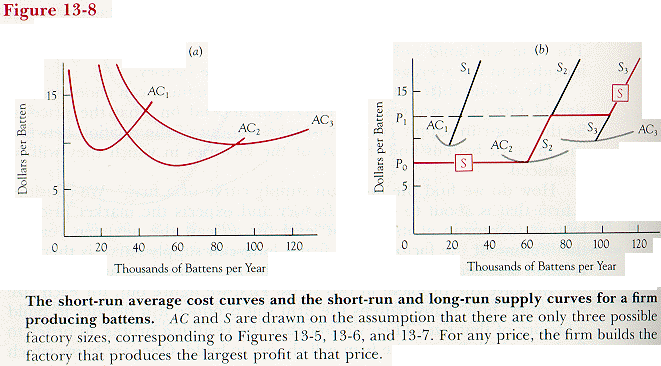 Looking at Figure 13-8b, we see that the smallest size of factory is irrelevant to the firm's supply curve, since there is no price of battens at which it would be worth building such a factory. If the market price is below P0, none of the three sizes of factory can make enough money to justify the cost of building it, so the firm produces nothing. For prices between P0 and P1 on Figure 13-8b, the firm maximizes its profit by building a $3 million factory and producing the quantity for which the marginal cost (MC2 on Figure 13-6a) equals the price. For prices above P1, it does better building a $5 million factory and producing along the MC3 curve of Figure 13-7a. So S is the firm's long-run supply curve.