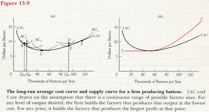 Figure 13-9a shows the short-run and long-run average cost curves for a firm that can choose from a continuous range of factory sizes. Figure 13-9b shows the long-run average cost curve and the long-run supply curve for such a firm. Every time the price goes up a little, the optimal size of factory shifts up as well. The result is the smooth supply curve of Figure 13-9b.