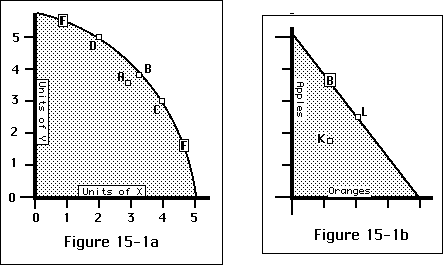 Possibility sets and frontiers. Figure 15-la shows a production possibility set; F is its frontier. Figure 15-1b shows the set of alternative bundles available to a consumer; the budget line B is its frontier.