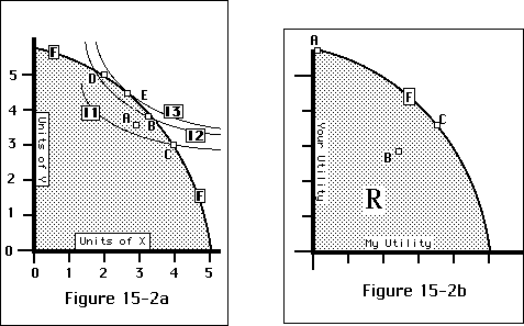 In the case of output, we have a common measure by which to compare various points on the boundary: the utility of the individual consuming the output. This lets us compare two alternative output bundles, one of which contains more of one output and less of another. The important difference between Figure 15-2b and Figure 15-2a is the absence of indifference curves on 15-2b. The problem in comparing outcomes that affect several people is that there is no obvious way of comparing two different outcomes, one of which produces more utility for me and less for you than the other.