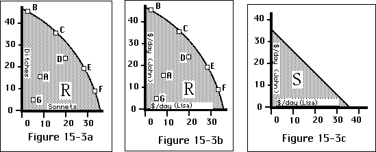 This is the first time I have talked about the idea of production efficiency, but not the first time I have used it. From Chapter 3 on, I have been drawing figures with possibility sets and frontiers. A budget line, for example, is the frontier of a possibility set--the set of bundles it is possible to purchase with a given income. In indifference curve analysis, we only consider points on the budget line, not points below it, even though points below it are also possible--we could always throw away part of our income. Figure 15-1b shows this. The shaded area is the consumption possibility set. The line B is the consumption possibility frontier, alias the budget line.