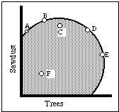 4. The shaded area on Figure 15-4a is the possibility set for a worker working eight hours a day cutting down trees and making sawdust. Which labeled points are output efficient? Which are output superior to A? to B? to D? Which labeled points is A superior to? What about D?
