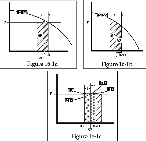 The same argument applies if we decrease output instead of increasing it; this time, look at Figures 16-1a and 16-1c. The reduction in output by the firm saves it area A4 < AP, and the loss in consumption to Uno costs him area A1 > AP; again there is a net loss.