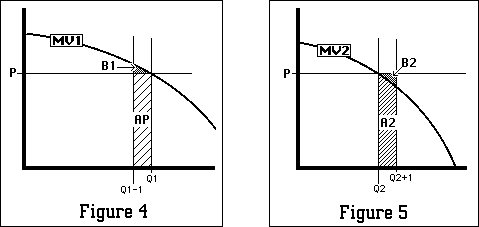 Shuffling Money. One element in my proof of the efficiency of a competitive equilibrium that may have confused you is the way in which many of the arguments seemed to ignore money payments. I described the cost of an extra hour of labor as its marginal disvalue to the worker, but I then went on to say that the worker was no worse off, since he was paid for his time. I calculated costs and benefits to consumers Uno and Duo by looking at the area under their MV curves rather than by looking at their consumer surplus--the area under the curve and above price. I described the cost to a firm of producing an extra unit as MC, while ignoring the income it got from selling that unit.