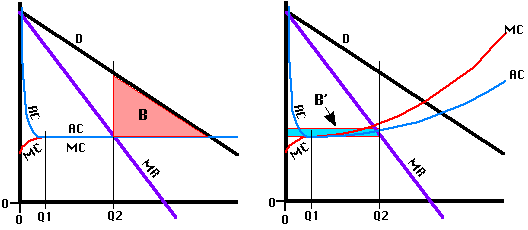 What the demonstration does imply is that if the cost curves are consistent with competition, as in Figures 16-4a and 16-4b, a competitive industry results in a greater net benefit than a monopoly. This is an argument not against natural monopolies but against government-enforced monopolies (or cartels) in naturally competitive industries, such as trucking or agriculture. In Figure 16-4a, the average cost for a large firm (producing Q2) and a group of small firms (producing Q1 each) are the same, so the loss due to a government-enforced monopoly is the loss of the area B, the consumer surplus on the goods that would be produced if the industry were competitive but are not produced when it is a monopoly. In Figure 16-4b, the large firm has larger costs than the small, as we would expect in a naturally competitive industry, so there is the additional loss of the area B', equal to the difference in average cost between five small firms and one large one times the monopoly output.