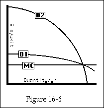 The problem is the second efficiency condition. The combination of marginal cost pricing plus a subsidy to cover the resulting loss will permit a monopoly to stay in business even if it does not meet the second efficiency condition--even if its costs are larger than the value to its customers of what it produces. In order for the regulatory agency to subsidize only those monopolies that should stay in business, it must know not only the cost curves of the firm but also the demand curve for its output, so that it can calculate what consumer surplus will be if the firm sells at marginal cost. If the consumer surplus is less than the required subsidy, the firm should be allowed to go out of business. But all the agency can observe directly is one point on the demand curve: quantity demanded at a price equal to marginal cost. That point gives very little information about consumer surplus; through the same point, one can draw two demand curves (D1 and D2 on Figure 16-6), one of which yields almost no consumer surplus at a price equal to marginal cost and one of which, at the same price, yields a very large consumer surplus.