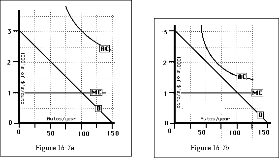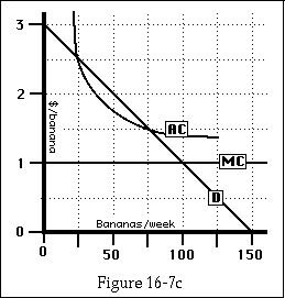 A glance at AC on Figure 16-3 should convince you that that is wrong; if the firm is broken up into ten smaller firms, average cost will be much higher and the price will go up instead of down. Not only that, but the situation will be unstable. Since average cost falls as output increases, one of the firms will expand, driving (or buying) out the others. We will then be back where we started, with a single monopoly firm.