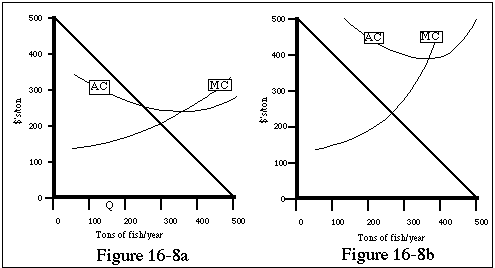 4: Figures 16-8a and 16-8b show two alternative sets of cost curves that the Minnokarp fish farm might face. Answer the following questions for each: