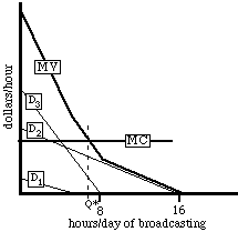 As usual, the efficient solution is to produce where MV=MC--to keep increasing the number of hours as long as the value of an additional hour to the listeners is at least as great as its cost of production. We know from Chapter 4 that each demand curve is also a marginal value curve. Each extra hour of broadcasting benefits all three customers; its marginal value is the sum of its marginal value to Customer 1, its marginal value to Customer 2, and its marginal value to Customer 3. So the total MV curve is the vertical sum of the MV curves for the customers, each of which equals the corresponding demand curve. The result is shown on the figure. Q* is the efficient quantity.