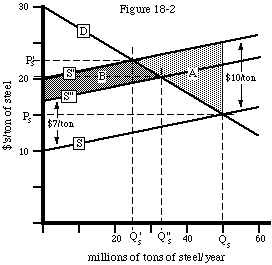 Figure 18-2 is a graphical analysis of the inefficiency due to an externality. D is the demand curve for steel. S is the industry supply curve for the competitive industry that produces steel. The industry produces a quantity Qs at a price Ps.