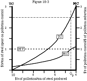 If steel firms install the efficient level of pollution control, they will spend $2.50/ton on pollution control and produce $4.50/ton worth of pollution. The cost of producing steel, including the cost to the producers of controlling pollution and the cost to everyone else of the pollution they do not control, is $7/ton higher than the cost to the firms of producing steel with no pollution control. The corresponding supply curve is S'' on Figure 18-2. The efficient quantity of steel is Qs''.