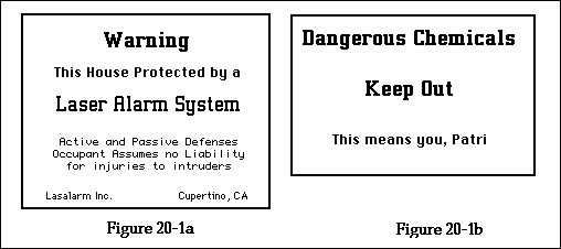 Figure 20-1b shows another of my precautions--a solution to a problem that Superthief does not discuss. One of the rooms in the back part of my house contains some things that a thief might well find worth stealing; for that reason, I have equipped it with its own deadbolt lock. This raises a problem. A rational thief will assume I am a rational victim and deduce that if I have a lock on that door, it is probably because I have things worth stealing behind it. My solution is the sign shown in Figure 20-1b. It is intended to suggest an alternative explanation for the lock--dangerous chemicals in the room and a curious child in the house. The solution is original with me, but I believe Superthief would approve.