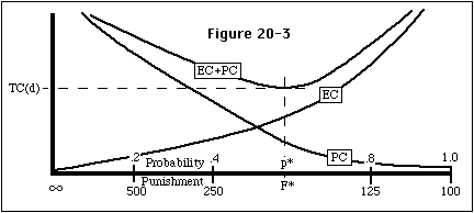 Figure 20-3 shows the logic of the situation graphically. We are varying the probability of punishment from 0 to 1, while maintaining a constant level of expected punishment (equal to probability times punishment: pxF) and hence of deterrence; the lower the probability (p), the higher the punishment (F). The horizontal axis shows both probability and punishment; the vertical axis shows cost. The curve EC is enforcement cost. The larger the fraction of criminals we want to catch the more we must spend on police and courts, so EC rises as probability increases. The curve PC is punishment cost. The more severe the punishment the higher the cost of imposing it, so PC increases with amount of punishment (and thus decreases with probability of punishment). EC+PC is the total cost of catching and punishing criminals. Its minimum is at p*, so p* (and the corresponding punishment F*) represent the lowest cost combination of probability and punishment to produce a given expected punishment and hence a given level of deterrence. By repeating the calculation for every level of deterrence we could generate a total cost curve TC(d), showing the cost of producing any level of deterrence, d.