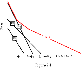 In Chapter 3, we saw how the behavior of an individual consumer led to a demand curve, a relation between the price at which he could buy a good and the quantity he chose to buy. In most markets, all customers pay about the same price, so we can talk of a single market price and a single demand curve, representing the total demand of all consumers for the good as a function of its price. Since total quantity demanded at any price is the amount I want to buy at that price plus the amount you want to buy at that price plus the amount he wants to buy at that price plus . . . , the market demand curve is the horizontal sum of the individual demand curves, as shown in Figure 7-1.