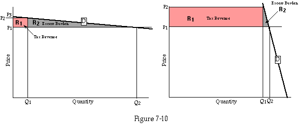 Figures 7-10a and 7-10b show that the relation between R1 and R2 depends on the shape of the demand curve. If it is very flat (demand is highly elastic), then the increased price due to the effect of the tax (from P1 to P2) results in a large reduction in quantity demanded and a large loss of consumer surplus relative to the amount of tax revenue collected. P3 on the diagram is the price at which quantity demanded is zero (the choke price); for a tax that raises the price of the good that high, R2 is substantial (the entire consumer surplus at P1) and R1 is zero. The effect of such a tax is all excess burden and no revenue at all.