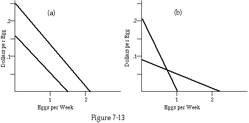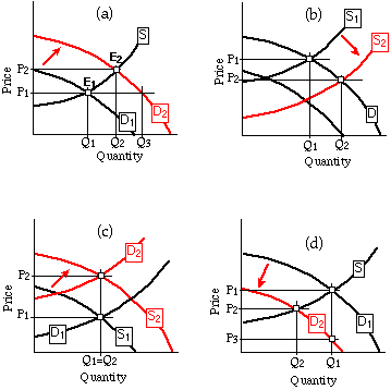 Figure 7-4a shows a supply-demand diagram with a shift in the demand curve from D1 to D2. One can imagine this resulting from a change in tastes (widgets become more popular), weather (it has been a hot summer and widgets work better in hot weather), the price of other goods (widgets use a lot of widget oil, the price of which has just fallen), consumer incomes, expected future prices, or whatever. The demand curve has shifted out. Demand has increased--at every price, the new quantity demanded is larger than the old. The result is to move the equilibrium point from E1 to E2. Both equilibrium price and equilibrium quantity increase.