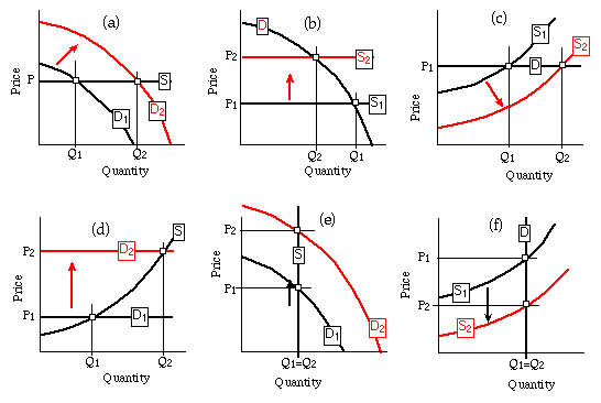 In Figures 7-5c and 7-5d, demand is perfectly elastic. Consumers are willing to buy an unlimited quantity at a price P on Figure 7-5c (or any lower price, but . . .) and nothing at any higher price. A shift in supply (Figure 7-5c) leaves price unaffected but changes quantity by the (horizontal) amount of the shift. A shift in demand (Figure 7-5d) changes price by the vertical amount of the shift and quantity by the effect of the price change on the quantity supplied.