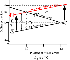 Suppose, for example, that the government imposes a lump sum sales tax of $1/widget; for every widget that is sold, the producer (assumed to be the seller--there are no middlemen at this stage of the analysis) must pay the government $1. The result is to shift the supply curve up by $1, from S1 to S2, as shown in Figure 7-6.